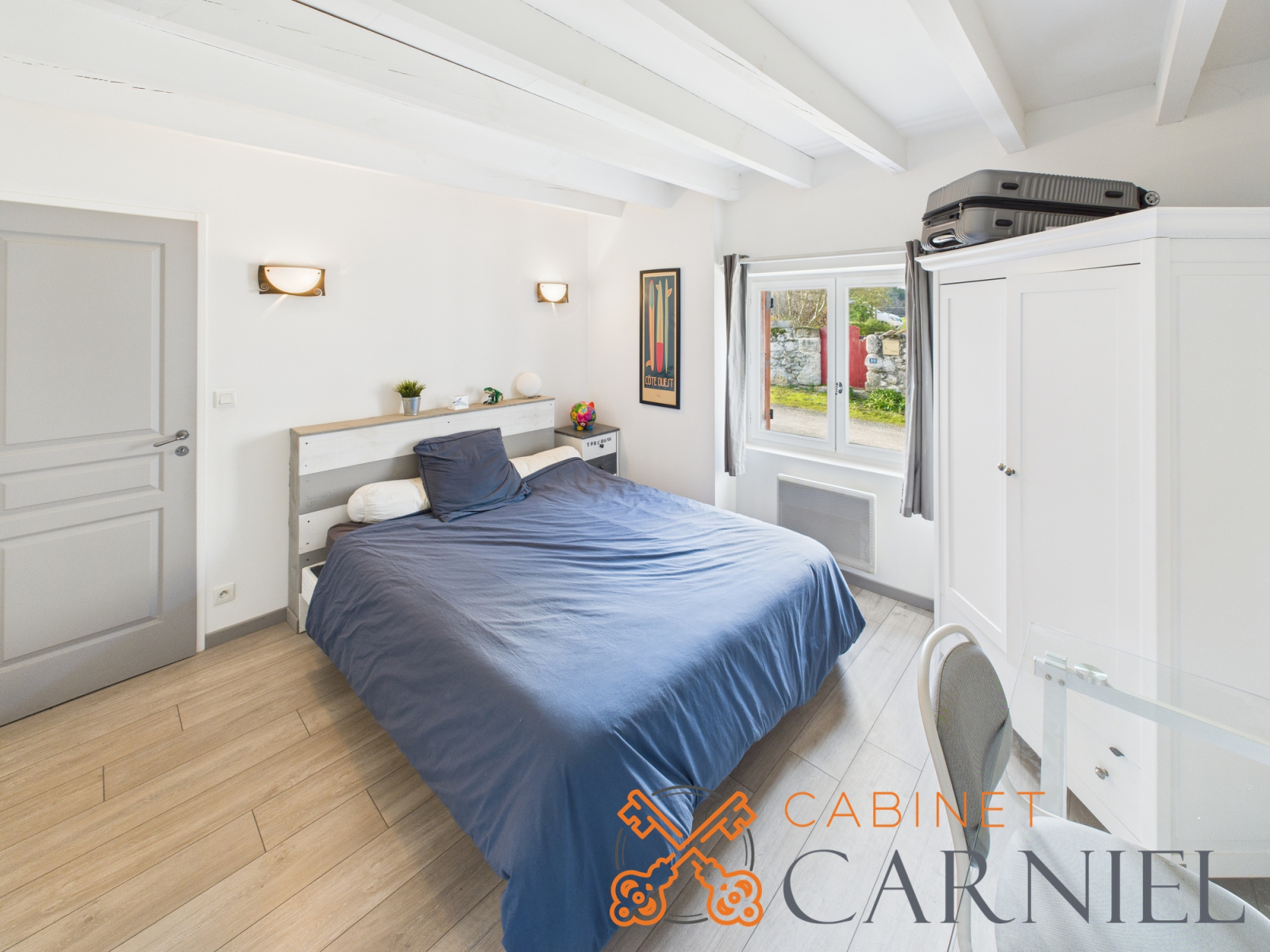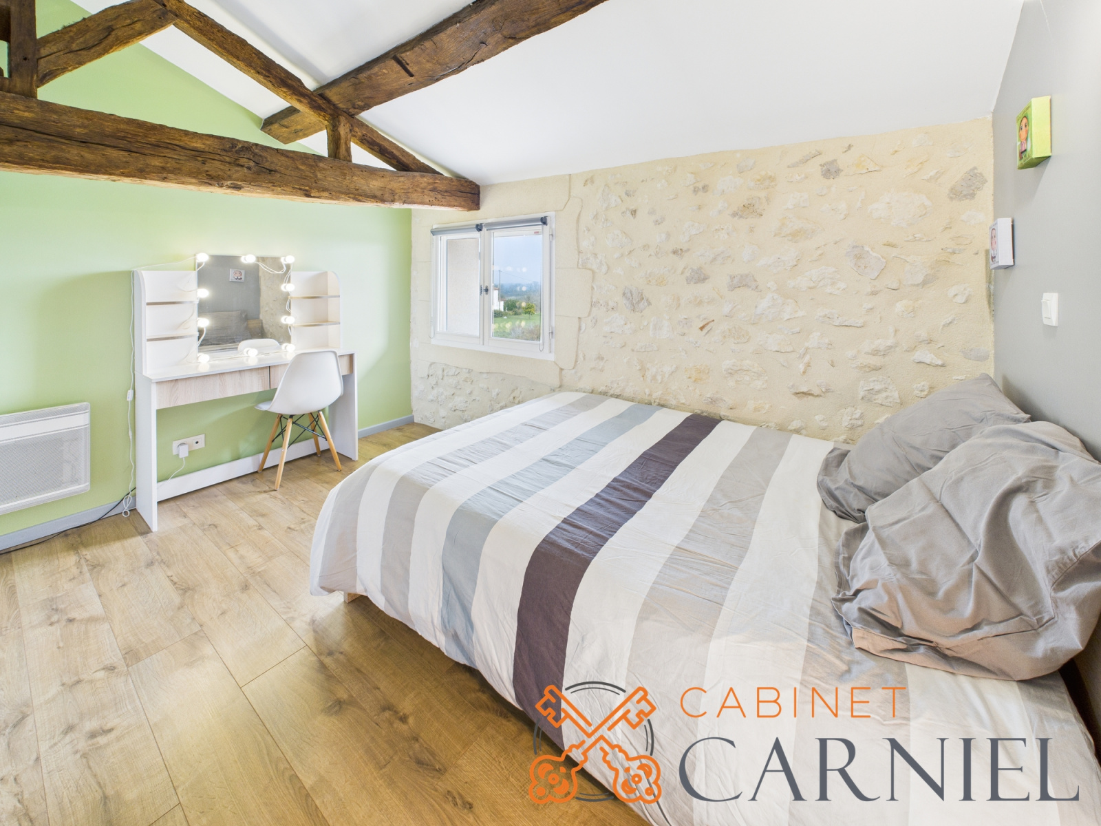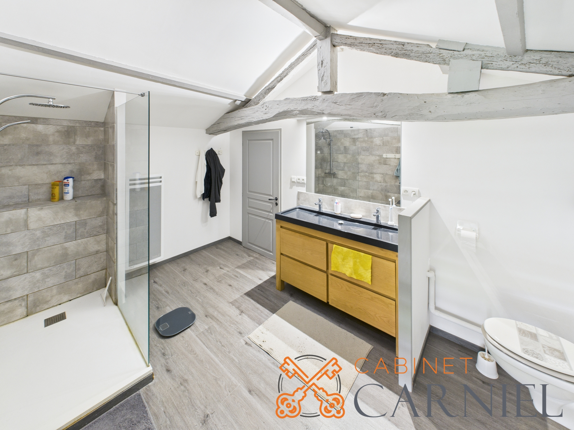 Au 1er étage, le couloir distribue 3 chambres dont une avec dressing, et une grande salle d'eau avec WC.